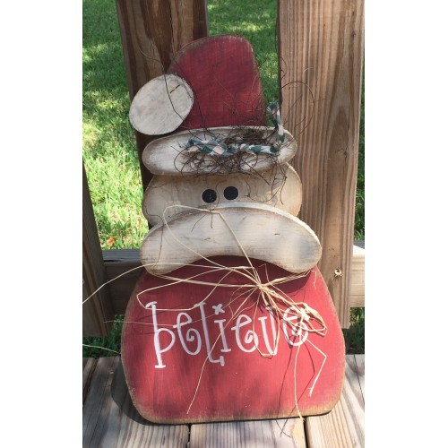 Believe Wood Santa, measures 18 inches high and 11 inches wide. Has a hanger on the back to hang Santa by. Handmade in America.