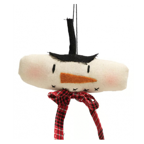 This primitive snowman ornament is stuffed fabric with a stitched face, plaid scarf, and a whimsical top hat. It will add a playful charm to any winter collection. Measures 4 inches tall by 5 1/4 inches wide across and hangs by a black string. - Material: Fabric - Color: Ivory, Black, Red