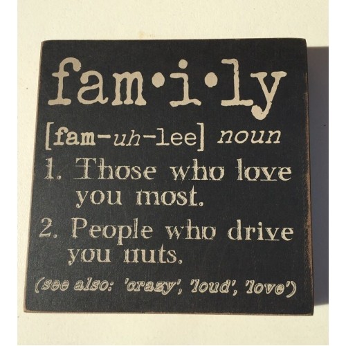 Family Definition Sign This small wood sign features rustic lettering spelling out "Family," plus an inspirational definition. Background is black with light colored lettering.