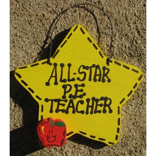 Teacher Gifts for different school positions. Yellow Star with stitching around the edges and a apple in the lower left corner. Hangs by Wire. Show your favorite school employee that they are an All-Star. This star has All Star P. E. Teacher written on it. Size: 5 inches wide by 5 inches high. Handmade in Texas
