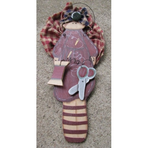 Country Crafts Wooden Mauve Angel with Cloth Wings. Across the front of dress is a pair of scissors and a spool of thread. Hangs by wire 903SM Sewing Angel -Cloth Wings measures 11"H x 5 1/2"W x 1/4"D