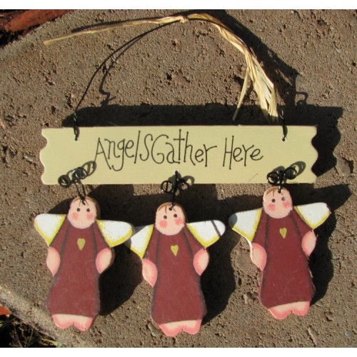 Country Crafts WD1093 Angels Gather Here, measures Measures 4 inches long by 3 1/4 inches wide, Hangs by wire with a raffia bow
