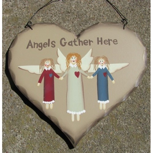 Primitive Wood Angel Heart HP24-Angels Gather Here, measures 8" x 7" and hangs by wire
