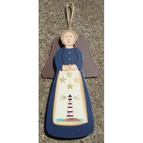 WD1393 - Lighthouse wood Angel, wood angel with metal wings, measures 2 inches wide by 4 1/2 inches high and hangs by jute