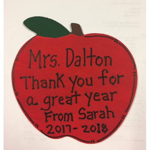 Hand Painted Apple with the saying" teachers name) Thank you for a great year From (child's name) and (current) year " Hangs by wire. Size: 5 1/2 inches high by 5 inches wide. The teacher's name can be changed providing it's not to long and the child's name can also be changed. This Apple is just to give you a visual on how it would look. Can use for a end of school year gift Handmade in La porte, TX
