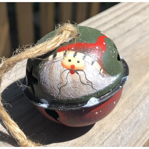 66283TrH - Santa Green Bell with Red Hat - Metal-Hangs by Jute and meausres 2 inch in diameter
