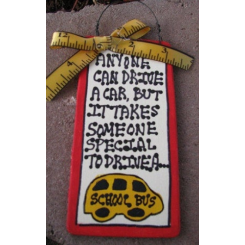 Anyone car drive a car, but it takes someone special to drive a bus. Great gift for your special school bus driver Measures 2 5/8 inches Wide x 5 3/8 inches high , Handmade in LaPorte, Texas and Wire to Hang.