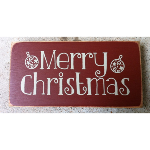 Merry Christmas Block is Stained on Back & Sides. The front is painted burgundy. Merry Christmas is stenciled in White. Handmade in America Finish: Sanded edges create a worn look. Measures 6 L x 3 H Inches
