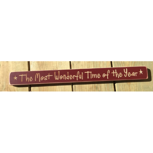 The Most Wonderful TIme of the Year is Made of painted, distressed wood, painted burgundy, says The Most Wonderful Time of the Year Engraved Sign along with engraved star accents. Handmade in America Size: 18"L x 1 1/2"H Finish: Sanded edges create a worn look.