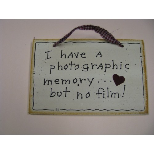 35231P I have a Photographic Memory...but no film! , wood sign, measures 6 inches wide by 4 inches high and has a reddish checkered gingham ribbon to hang by.