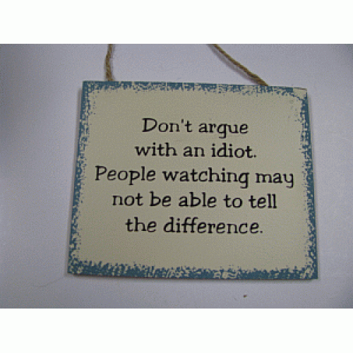 WS67 Don't Argue with an Idiot People watching may not be able to tell the difference wood block, measures 5 inches wide by 4 inches high, hangs by jute