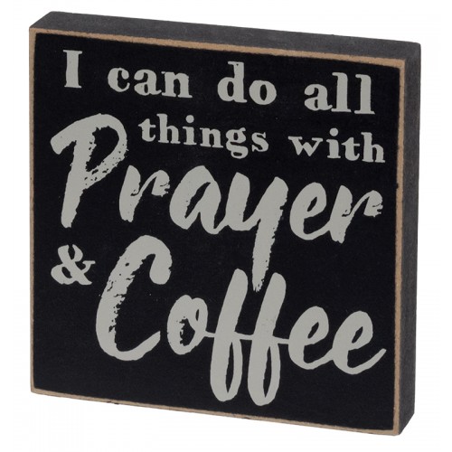 36910 All I need is a little coffee and a whole lotta Jesus wood block, measures 4 inches wide by 4 inches high. Has a slip notch on the back of the sign to hang or it can sit. painted black with light grey writing.