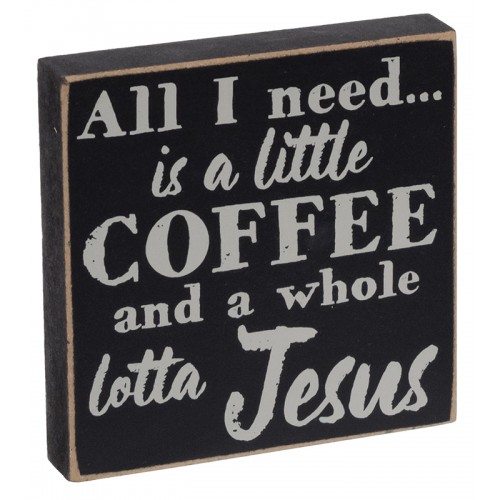 36910 I can do all things with Prayer and Coffee wood sign, measures 4 inches wide by 4 inches high. Has a slip notch on the back of the sign to hang or can sit. Black with light grey writing