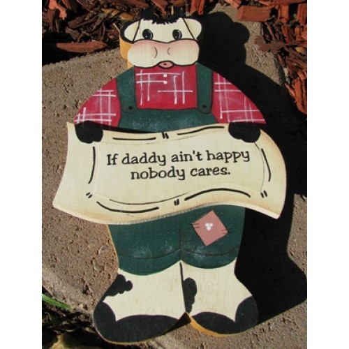713C - cow-daddy ain't happy who cares, measures 7 1/2 inches high by 4 1/4 inches wide and Handmade in America