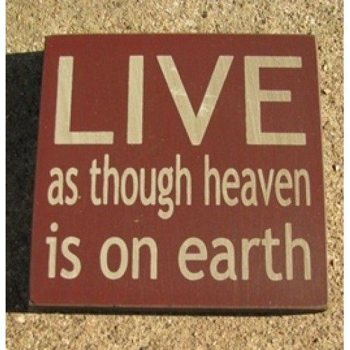 32343LM - Live as though Heaven is on earth, wood block, mesures 4 inches wide by 4 inches high. Burgundy in color with cream writing.
