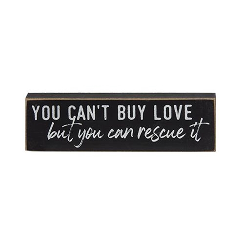 Block is made of wood and features a distressed black finish with the words "you can't buy love, but you can rescue it," written in white text with paw print accents. It looks great on shelves, counters, or tabletops and measures 1.5" high by 5" wide by .5" deep.