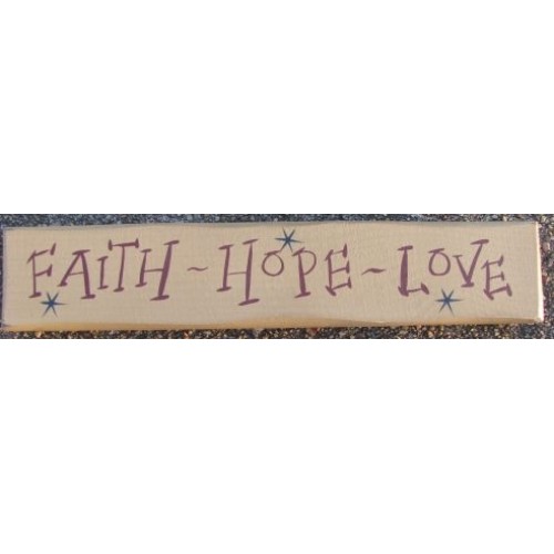 9007FHL- Faith Hope Love, wood block,measures 9 inches by 1 3/4 inches high. Cream in color with burgundy lettering.