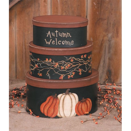 Autumn Welcome Stacking boxes set of 3 - 12inches high when stacked Largest Box was 10 inches wide by 7 1/2 inches deep, set of 3