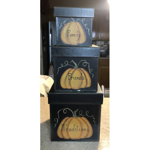 Family Friends and Traditions Fall Nesting Boxes, bottom box measures 6 wide by 6 inches high, middle box friends measures 4 3/4 inches wide by 4 3/4 inches high and top box measures 3 3/4 inches wide by 3 3/4 inches high. Wen stacked they are 14 1/2 inches high.