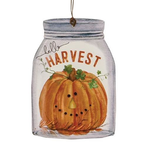 Hello Harvest Mason wood Jar Ornament The Mason jar ornament features the image of a smiling pumpkin with the words "hello harvest. this is a perfect wood ornament for decorating a fall tree, or simply hang on the wall as autumn decor. Wire hanger for display and Measures 4 inches high by 2 3/4 inches wide.