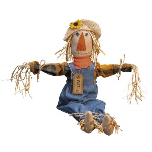 Patrick Scarecrow is a primitive scarecrow doll with floppy legs. He is wearing blue jean overalls and a plaid shirt with an orange scarf around his neck. A wooden bar goes across both arms with straw hanging out of both sleeves with jute ties. His feet are also accented with straw and jute ties. A straw hat accented by a sunflower and a craft paper name tag attached with a safety pin adds the finishing touch. Patrick has floppy legs so he can easily sit anywhere you want to add a primitive Fall touch! Material: Cotton, jute, straw, wood and Size: 21" H x 15" W