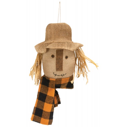 This primitive Scarecrow Head Hanger is stuffed muslin with a burlap hat, and an orange and black buffalo check scarf. He has raffia for hair and his folk art style face has a stitched mouth, a felt patch nose, and beaded eyes for a handmade look. This scarecrow will add a friendly face to a rustic Fall decor collection. Measures 12" H x 6" W x 3" D and has a string for hanging. Material: Fabric Color: Brown, Tan, Orange, Black