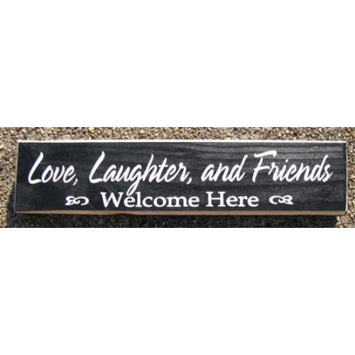 10150CL Love Laughter and Friends Welcome Here wood block, measures 8 inches wide by 1 1/2 inches high, painted black with white lettering