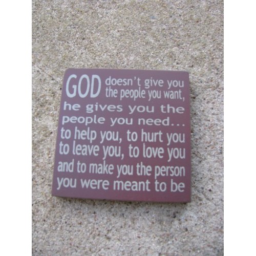 God doesn't give you the people you want, He gives you the people you need...to help you, to hurt you to leave you, to love you and to make you the person you were meant to be, measures 4 inches wide by 4 inches high, painted burgundy with off white lettering