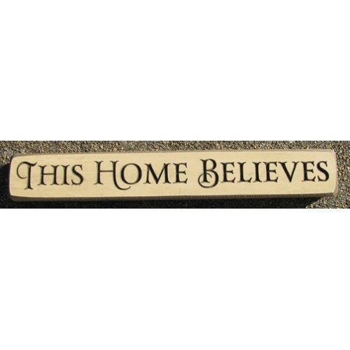 534THB -This Home Believes engraved wood block, measures 12 inches wide by 1 1/2 inches high, cream in color and Handmade in America