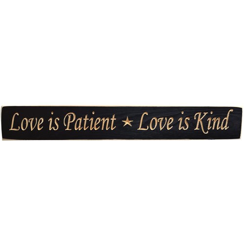 Painted, distressed wooden plaque, engraved with "Love is Patient...Love is Kind" in cheerful script, accented with a star. Carved notches in back make it easy to hang 24" long and 3-1/2" wide, 3/4" thick and Handmade in America