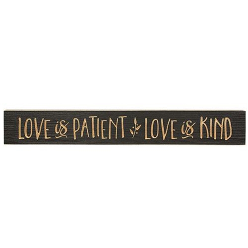 Love Is Patient, Love is Kind Sign is a dark gray, wooden sign with distressed edges. Sign is engraved with the phrase, "Love is Patient - Love is Kind," and a simple floral design accents the center of the phrase. Sign includes two pre-drilled keyhole hangers. Measures 24 ices wide by 3 1/2 inches high. Made in America.