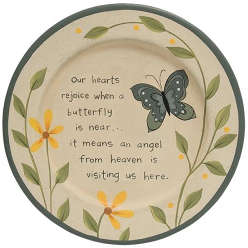 Loved One Butterfly Plate is a decorative, painted wood plate that features a blue butterfly design beside of the phrase, "Our hearts rejoice when a butterfly is near... it means an angel from heaven is visiting us here." The plate also has a floral border that is accented with yellow polka dots and daisies. Remember a loved one with this sweet, heartwarming plate. Measures 11 1/4 inches diameter. Item is for decorative use only.