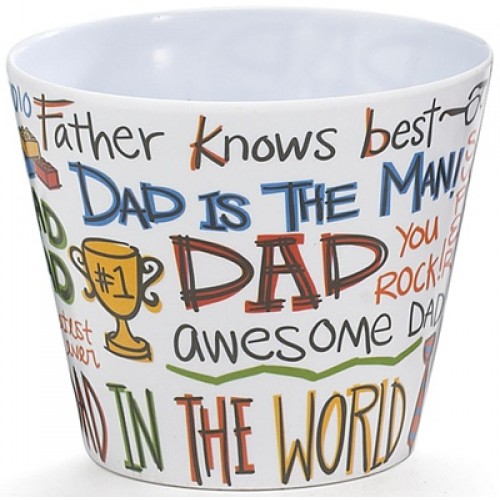 4" Melamine potcover with white background and colorful messages all over "Best Dad. Pops you're the tops. Dad is the man. Awesome Dad."