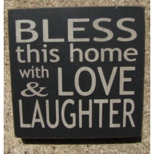 32348BB Bless This Home with Love and Laughter Wood Block, measures 4 inches squared and painted black with off white lettering