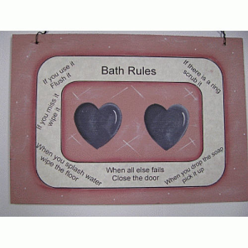 900BM- Bath Rules Mauve, measures 9 1/2 inches wide by 6 1/2 inches high. Handmade in America and wired to hang