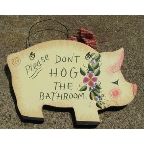 WD192 - Please Don't Hog the Bathroom, measures 5 1/2 inches wide by 3 1/2 inches high, hangs by wire and Handmade in America