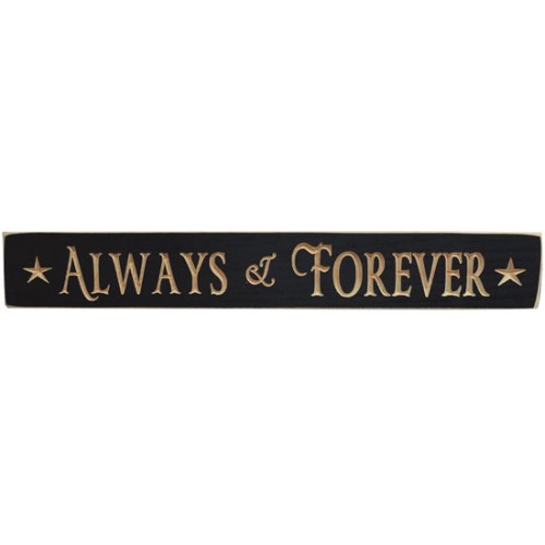 Painted Black, distressed wood sign, engraved with "Always & Forever" in cheerful script, accented with stars. Carved notches in back makes it easy to hang. 24 inches wide by 3-1/2 inches high. Handmade in America.