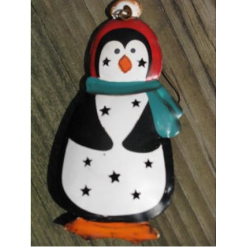 OR306- Penguin tin punched ornament,measures 4 inches high by 2 inches wide, and hangs by wire