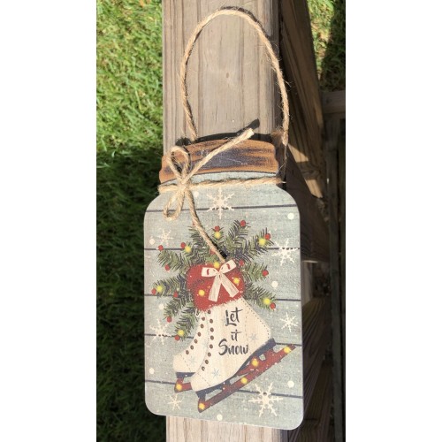 Primitive Wood 206-79098NB Let It Snow mason Jar size: 4 1/2 inches wide by 12 inches high w/hanger Hangs by Jute.