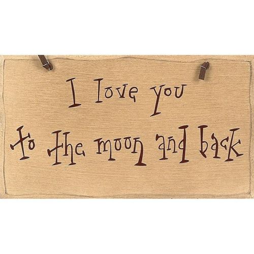 1045CP- I love you To the Moon & Back wood sign, measures 9 inches wide by 5 inches high, hangs by leather strap, and cream in color with burgundy letters