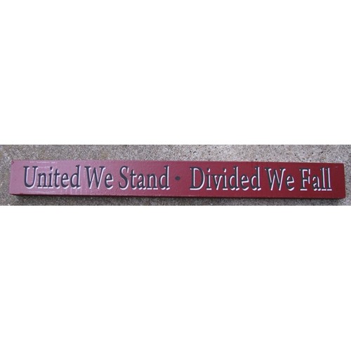 10966C- United we Stand * Divided we Fall wood sign, measures 16 inches wide by 1 3/4 inches high. Maroon with Black lettering.