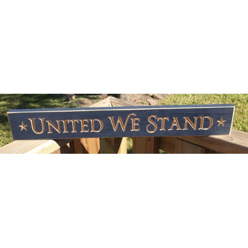 Painted Blue and distressed wooden plaque, engraved with bold lettering United We Stand, accented with stars. Perfect for a mantle, shelf, over a door, or hanging on the wall
