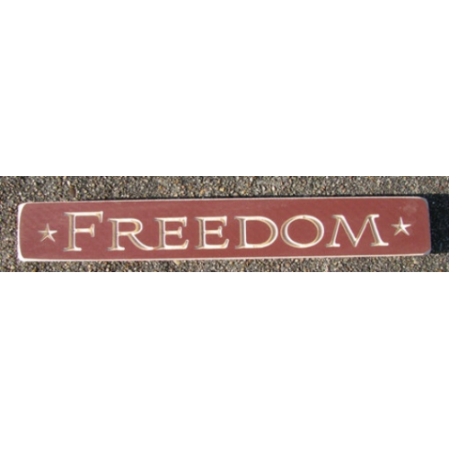 distressed wooden block, engraved with "Freedom" in bold, looping script, accented w/stars