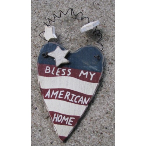 21685-Bless My American Home patriotic wood heart, measures 4 inches high by 2 3/4 inches wide and hangs by wire