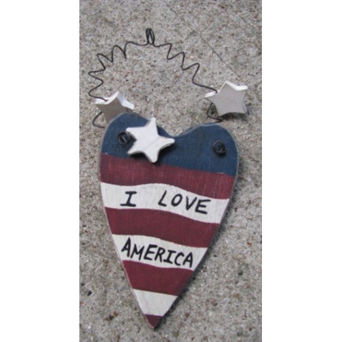 21685-I Love America Home patriotic wood heart, measures 4 inches high by 2 3/4 inches wide and hangs by wire
