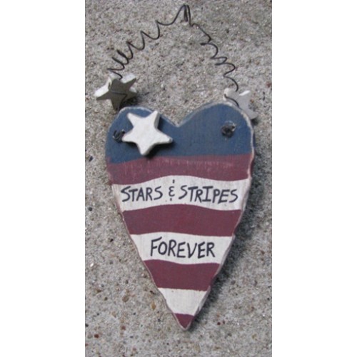 21685 - Stars & Stripes Forever Patriotic Heart, measures 4 inches high by 2 3/4 inches wide. Hangs by wire with wood stars.
