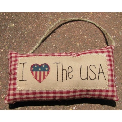31030ILU- I Love the USA cloth, measures 5 1/2 inches wide by 2 3/4 inches high, hangs by jute
