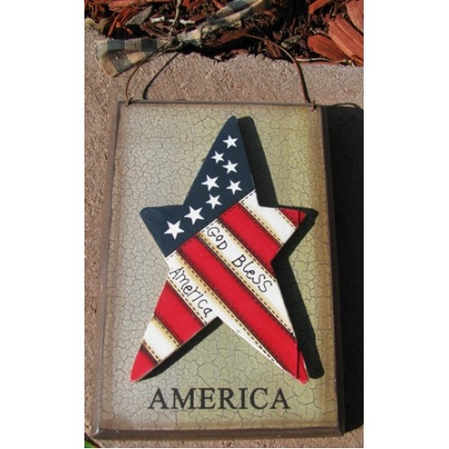 CWP1 - 3D Crackle -God Bless America Wood Sign, measures 5 1/4 inches high by 3 1/4 inches wide, hangs by wire and has a gingham bow.