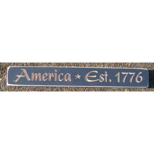 distressed wooden block, engraved with "America Est 1776 " in bold, looping script, accented w/stars
