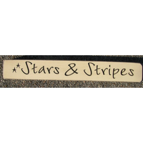 distressed wooden block, engraved with "Stars and Stripes" in bold, looping script, accented w/stars
